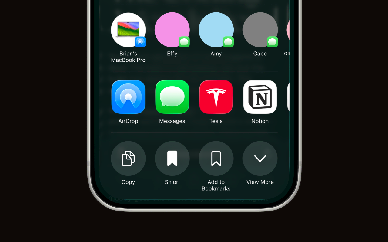 You're all set. Open any page, tap Share, and you'll see Shiori right in the quick actions row. Tap it to save the link to your reading list.