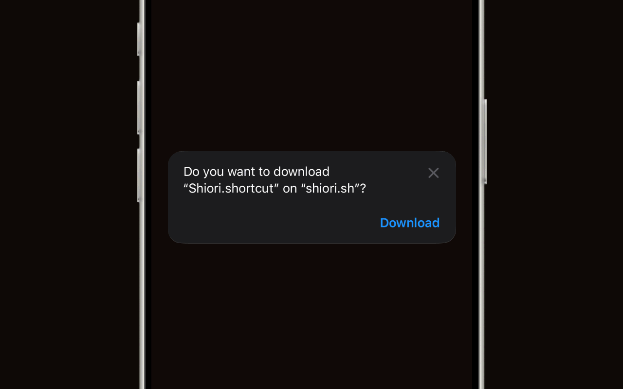 Tap Download shortcut. Safari will ask if you want to download "Shiori.shortcut" — tap Download.