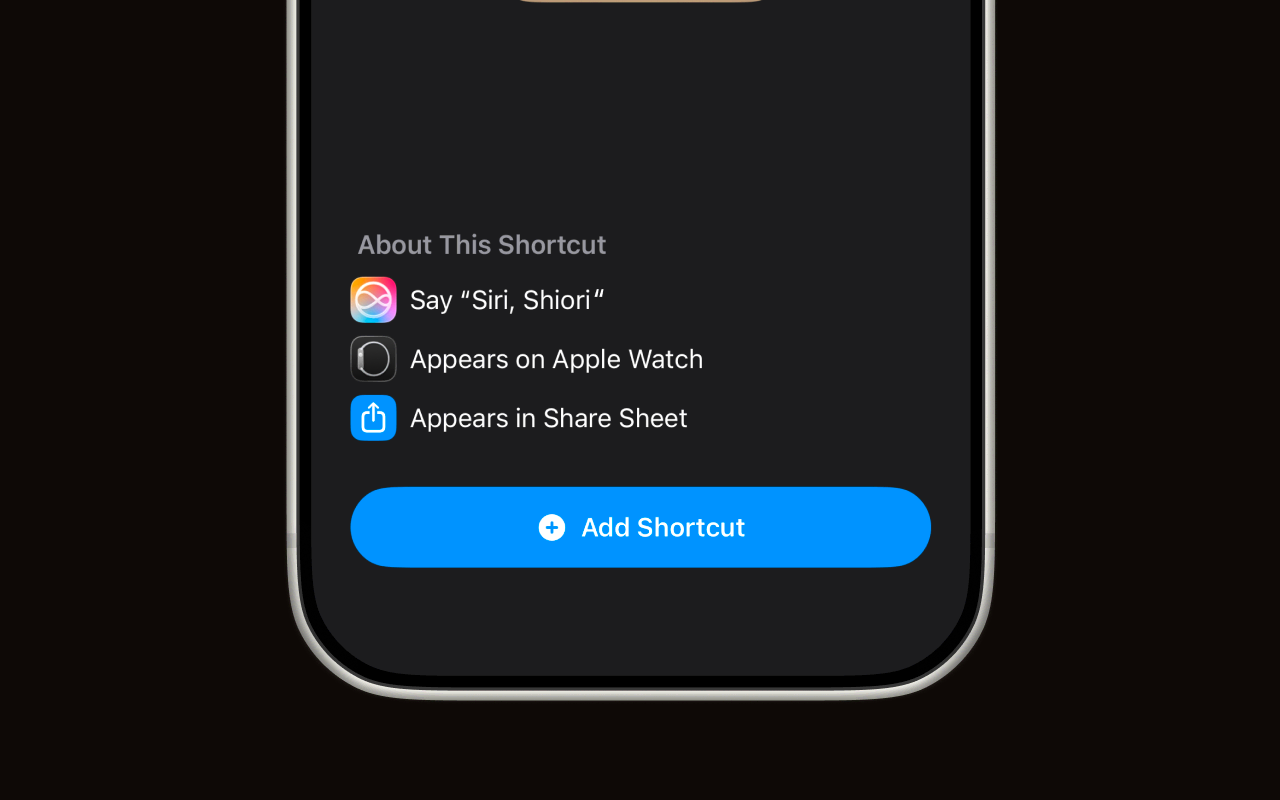 The Shortcuts app will show you a preview of the shortcut. You'll see it can be triggered via Siri ("Siri, Shiori"), from Apple Watch, and from the Share Sheet. Tap the blue Add Shortcut button.