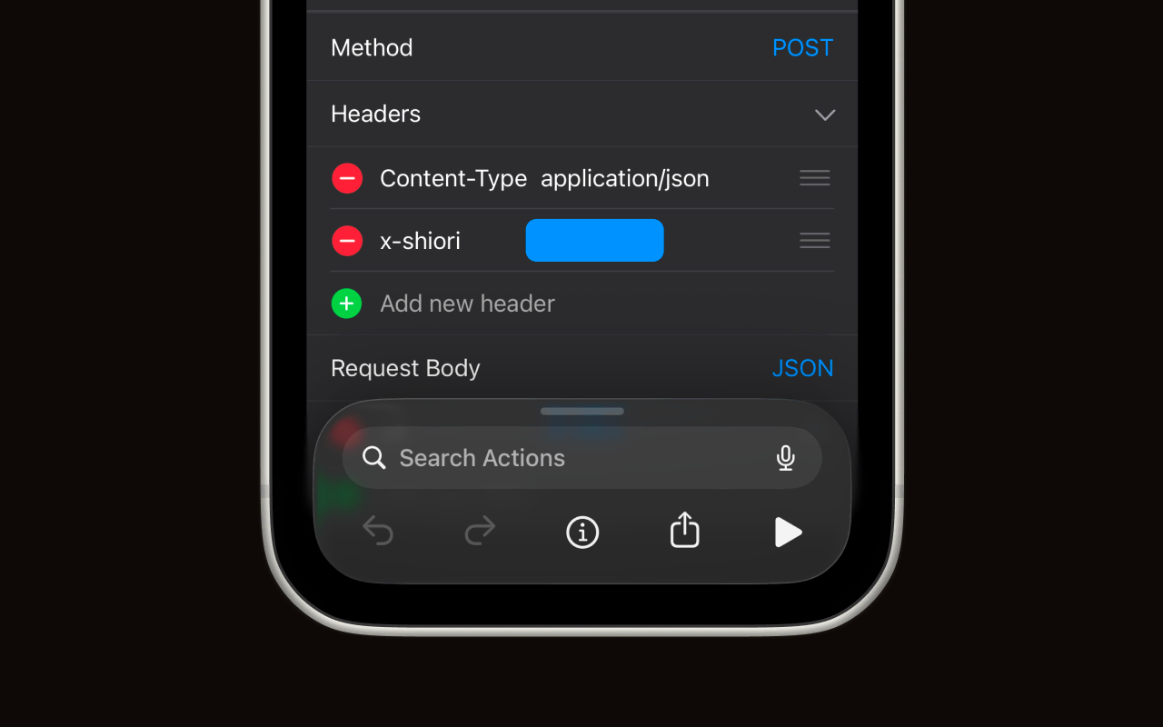 After adding, open the shortcut to edit it. Expand the last step of the shortcut and find the Headers section — you'll see a Content-Type header and an x-shiori header. Tap the x-shiori field and paste the shortcode you copied in Step 1.