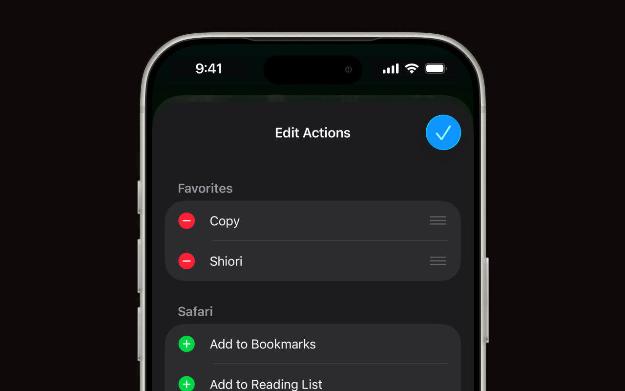 In the Edit Actions screen, find Shiori in the list and tap the green + button to add it to your Favorites. You can drag it to reorder. Tap the blue checkmark when done.